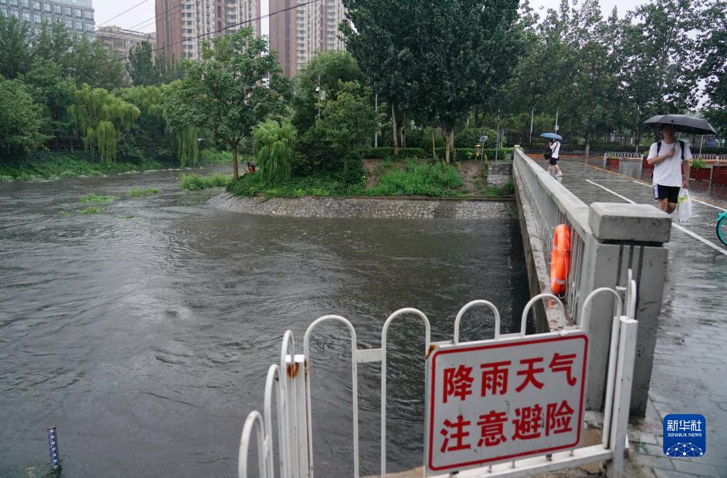 7月30日,在北京市涼水河周邊,市民冒雨出行。