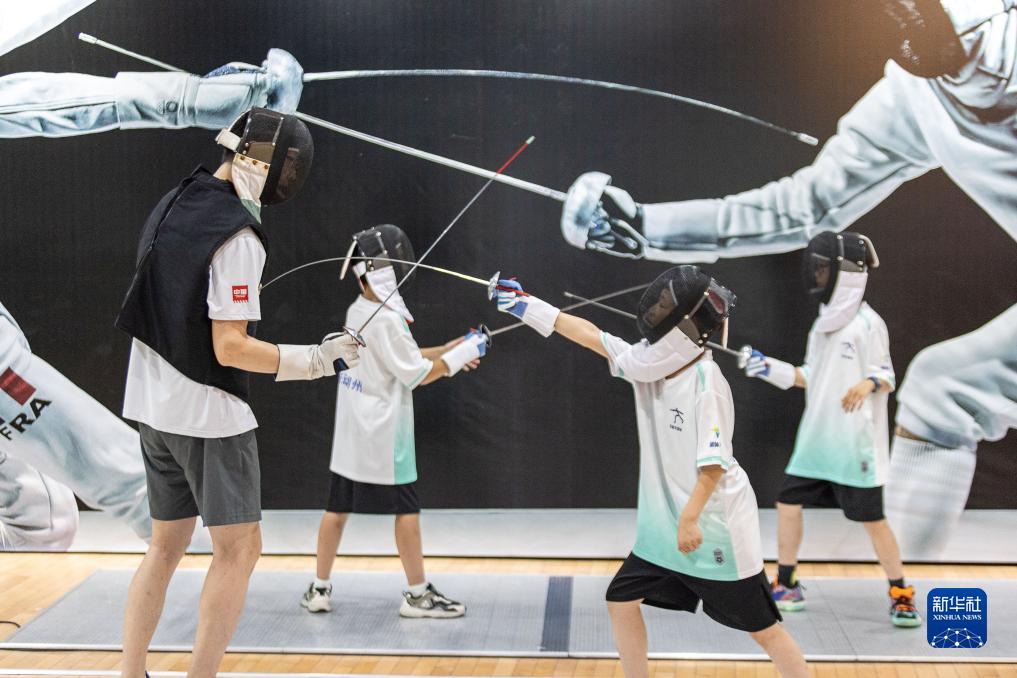 7月30日,在浙江省湖州奧體中心超越擊劍館,小朋友在練習擊劍攻防技巧。