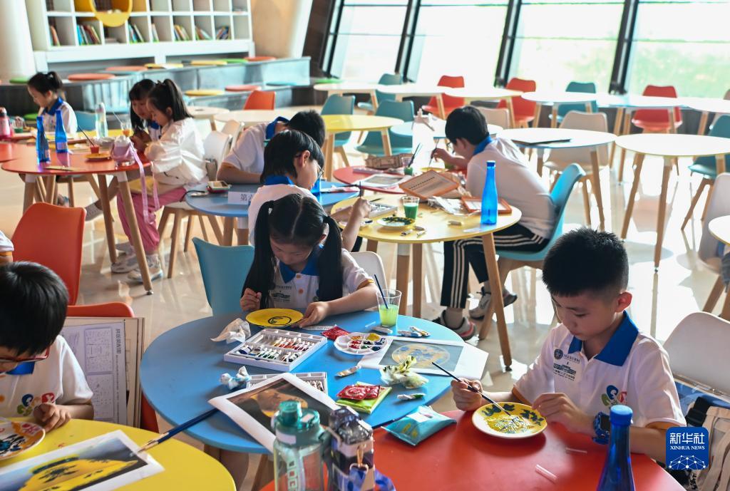 7月29日,在國家海洋博物館,學(xué)生們在體驗繪制外銷(xiāo)瓷。