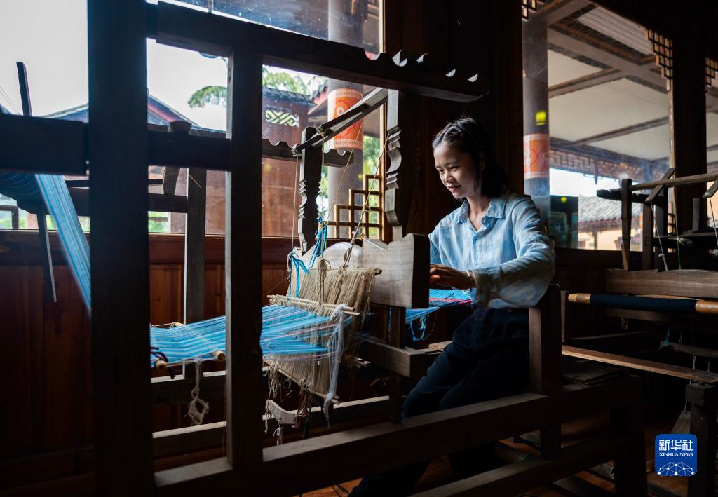 7月30日,一名游客在坡芽村坡芽傳習館內體驗壯族織布。