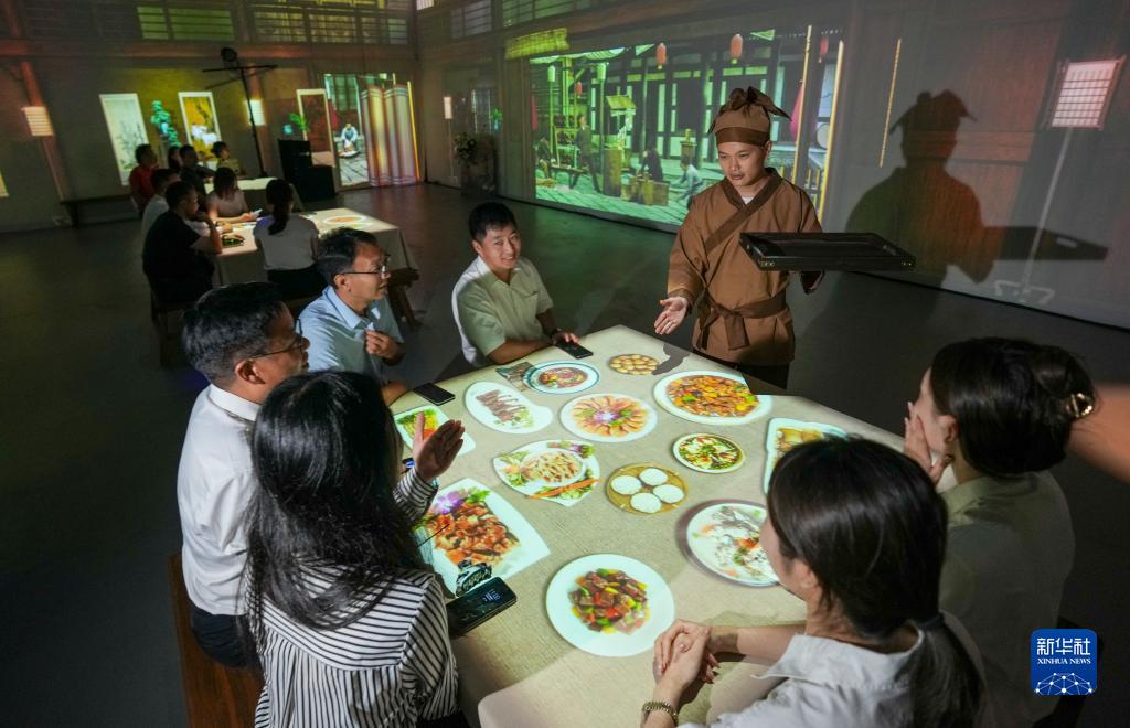 7月31日,游客在《畫(huà)游清明上河――故宮沉浸藝術(shù)展》孫羊店全沉浸光影空間內體驗宋朝時(shí)期餐館的生活。