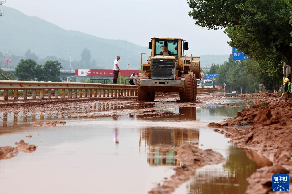 7月31日,在河北省井陘縣307國道長(cháng)崗村段,防汛工作人員駕駛機械清理淤泥。