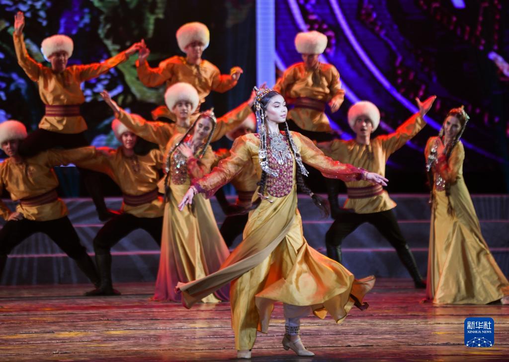 7月31日晚,在新疆人民劇場(chǎng),土庫曼斯坦國家舞蹈團演員在演出。