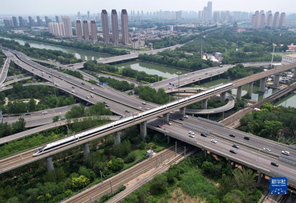 京津城際列車(chē)從天津城區穿行(7月20日攝,無(wú)人機照片)。