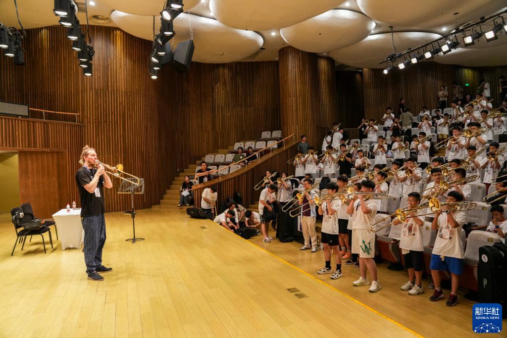 8月1日,在第九屆中國國際低音銅管藝術(shù)節的一場(chǎng)公益大師課上,來(lái)自意大利的長(cháng)號藝術(shù)家彼得·斯坦納(左)在指導愛(ài)好者練習長(cháng)號。