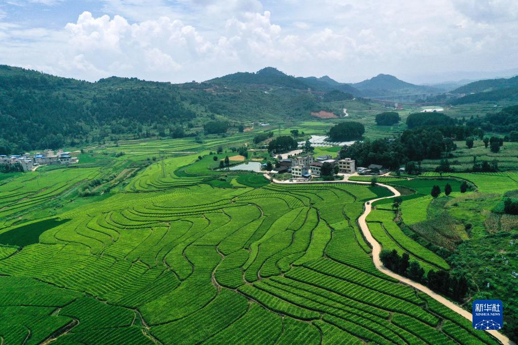 這是8月1日拍攝的貴州省岑鞏縣水尾鎮新場(chǎng)村雜交水稻制種基地(無(wú)人機照片)。