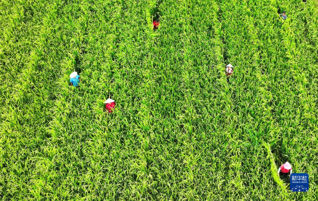 8月1日,農民在貴州省岑鞏縣水尾鎮新場(chǎng)村雜交水稻制種基地利用竹竿進(jìn)行人工“趕花”授粉(無(wú)人機照片)。