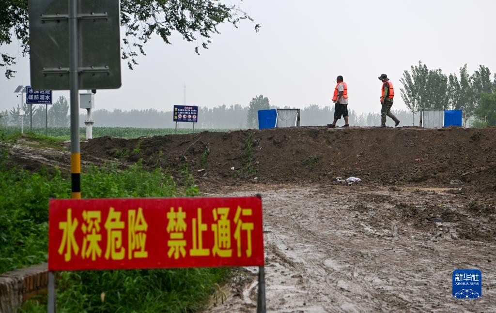 8月1日,在天津市武清區黃花店鎮邵七堤村,村志愿者在河堤上巡視。