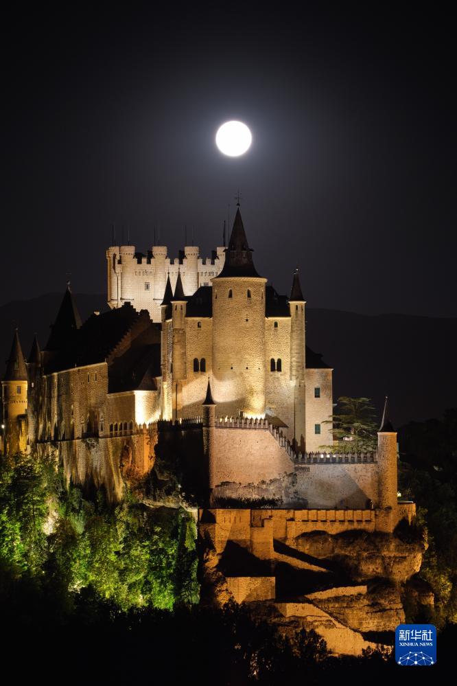 這是8月1日晚在西班牙塞哥維亞拍攝的“超級月亮”和塞哥維亞城堡。