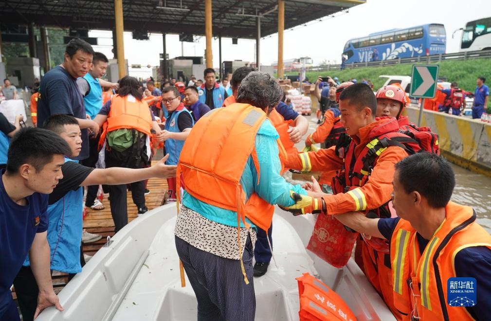 8月2日,受災群眾乘坐沖鋒舟抵達北京市房山區的京港澳高速琉璃河出口,準備前往轉運車(chē)輛乘車(chē)點(diǎn)。