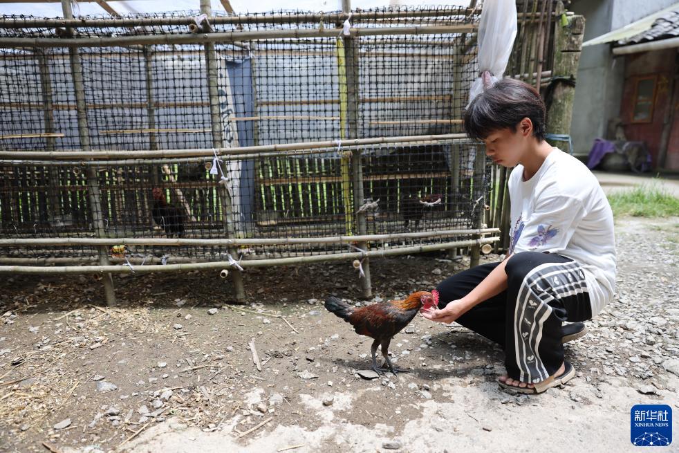 7月30日,在那坡縣百省鄉那布村水弄屯,陶文學(xué)在院子里喂雞。新華社記者李夢(mèng)馨攝