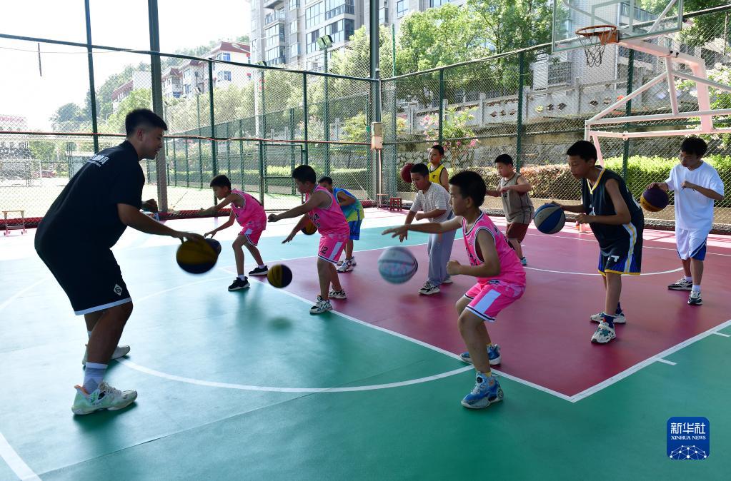 8月2日,在湖北省宜昌市秭歸縣一籃球培訓中心,教練楊皓鈞在教學(xué)生練習籃球基本功。