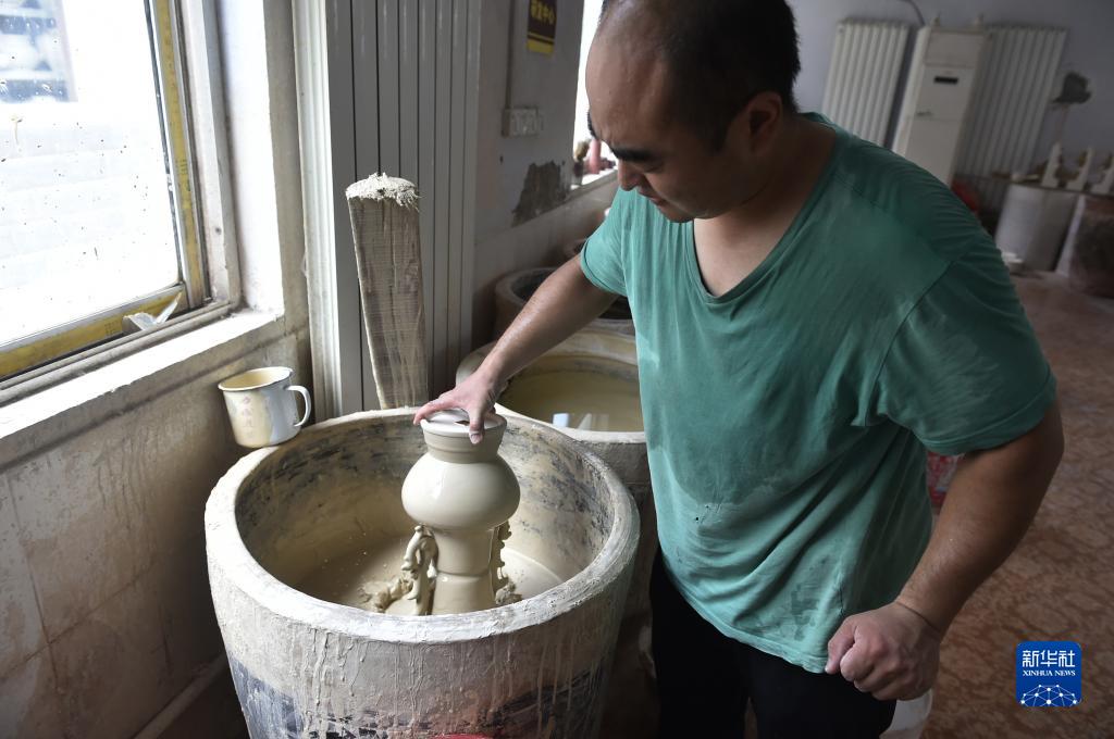 8月3日,河南省禹州市神垕鎮一家鈞瓷企業(yè)的工作人員在車(chē)間里施釉。