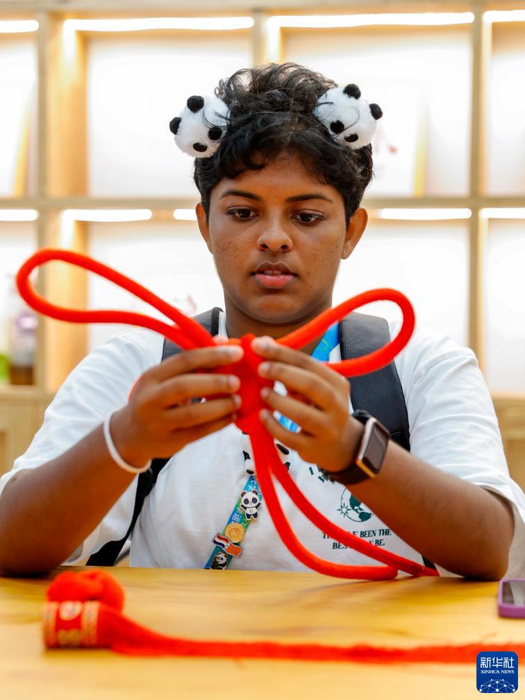 7月31日,在成都大運村的互動(dòng)體驗中心,斯里蘭卡運動(dòng)員哈西妮學(xué)習制作中國結。