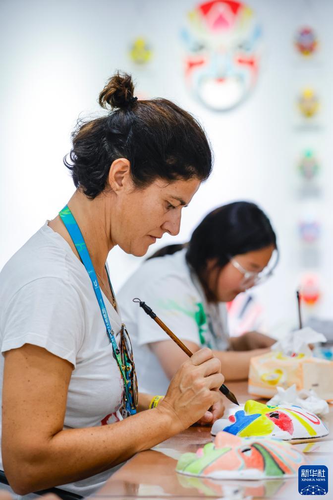 8月2日,在成都大運村的互動(dòng)體驗中心,意大利代表團成員費代麗卡·弗雷迪亞尼(左)繪制中國戲劇臉譜。