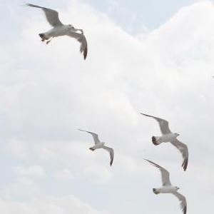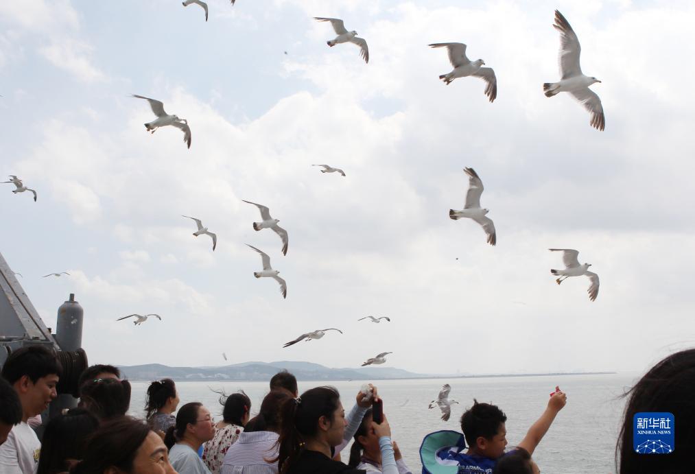 8月3日,游客在乘船前往蓬萊長(cháng)島時(shí)觀(guān)賞海鷗。