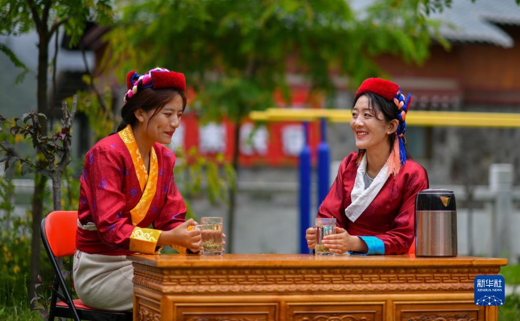 錯那市貢日門(mén)巴民族鄉斯木村第一書(shū)記尼瑪卓瑪(右一)在與村民一起品嘗莓茶(7月28日攝)。