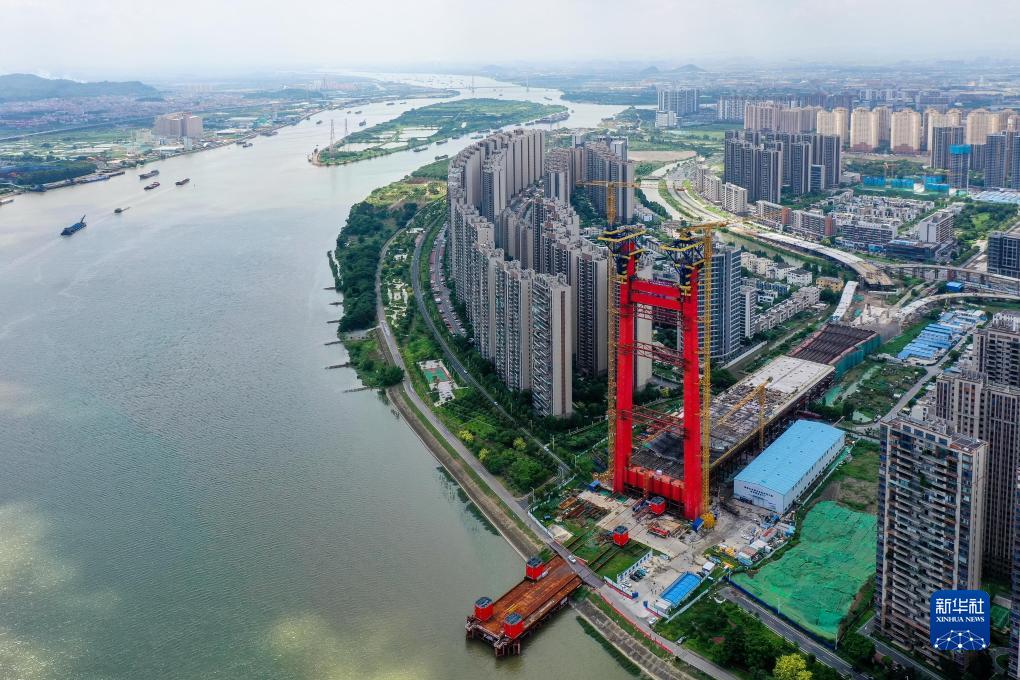 已經(jīng)完成上橫梁吊裝的順德大橋西主塔(無(wú)人機照片,8月4日攝)。