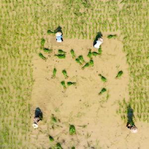 8月4日,在湖南省永州市道縣壽雁鎮芽洞村,農民搶插晚稻(無(wú)人機照片)。
