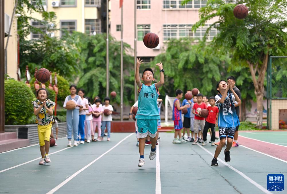 8月4日,參加暑期托管的學(xué)生在??谑杏⒉判W(xué)上籃球課。