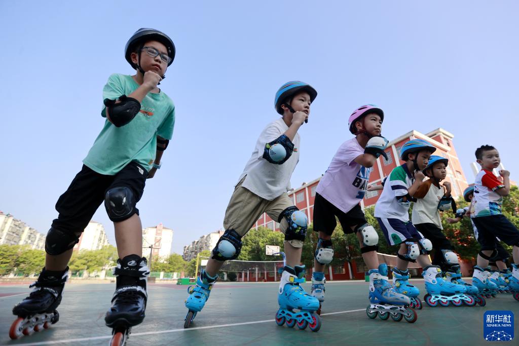 8月4日,在江西省吉安市峽江縣實(shí)驗小學(xué),孩子們進(jìn)行輪滑訓練。