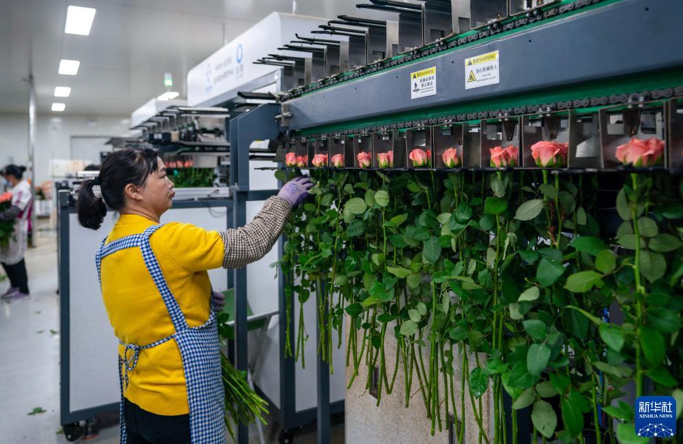 在云天化晉寧花卉產(chǎn)業(yè)現代化示范園內,一名花農將分揀好的鮮花放入包裝流水線(xiàn)進(jìn)行包裝(7月12日攝)。新華社記者 陳欣波 攝