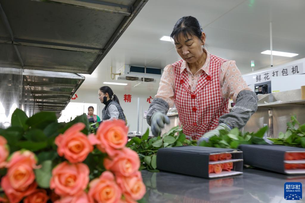 在云天化晉寧花卉產(chǎn)業(yè)現代化示范園內,一名花農在對包裝流水線(xiàn)上的鮮花進(jìn)行包裝(7月12日攝)。新華社記者 崔文 攝