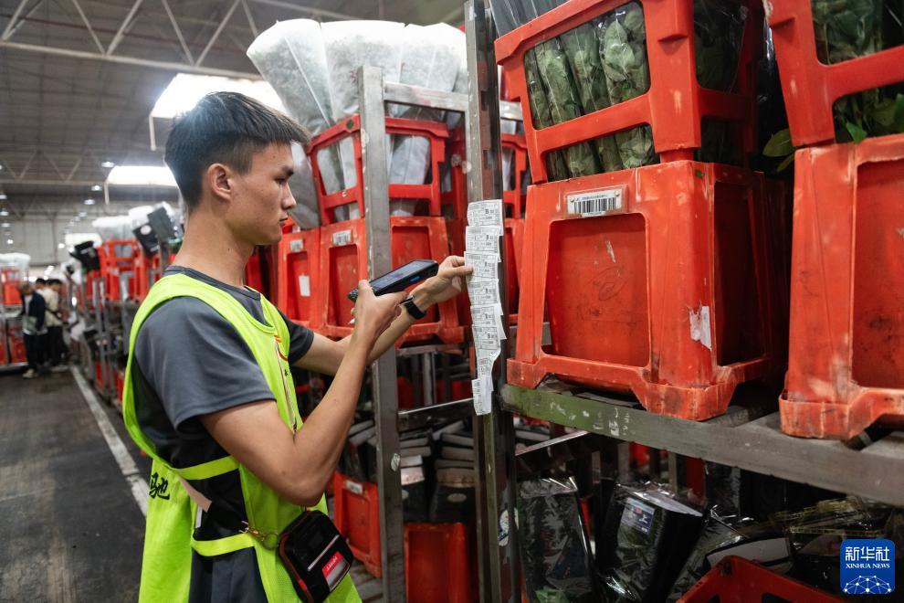 一名工作人員在昆明國際花卉拍賣(mài)交易中心內對臺車(chē)上存放的鮮花進(jìn)行掃碼(7月13日攝)。新華社記者 陳欣波 攝