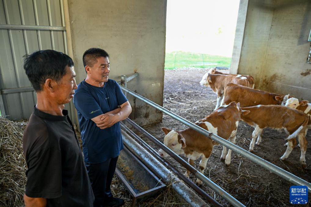 8月3日,在扎魯特旗巨日合鎮,百順養殖專(zhuān)業(yè)合作社負責人楊紹武(右)和養殖戶(hù)李和查看牛犢繁育情況。
