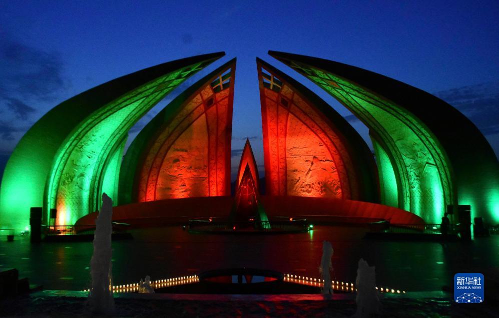 7月29日,巴基斯坦首都伊斯蘭堡的巴基斯坦紀念碑亮起中巴兩國國旗顏色的燈光,慶祝中巴經(jīng)濟走廊啟動(dòng)十周年。