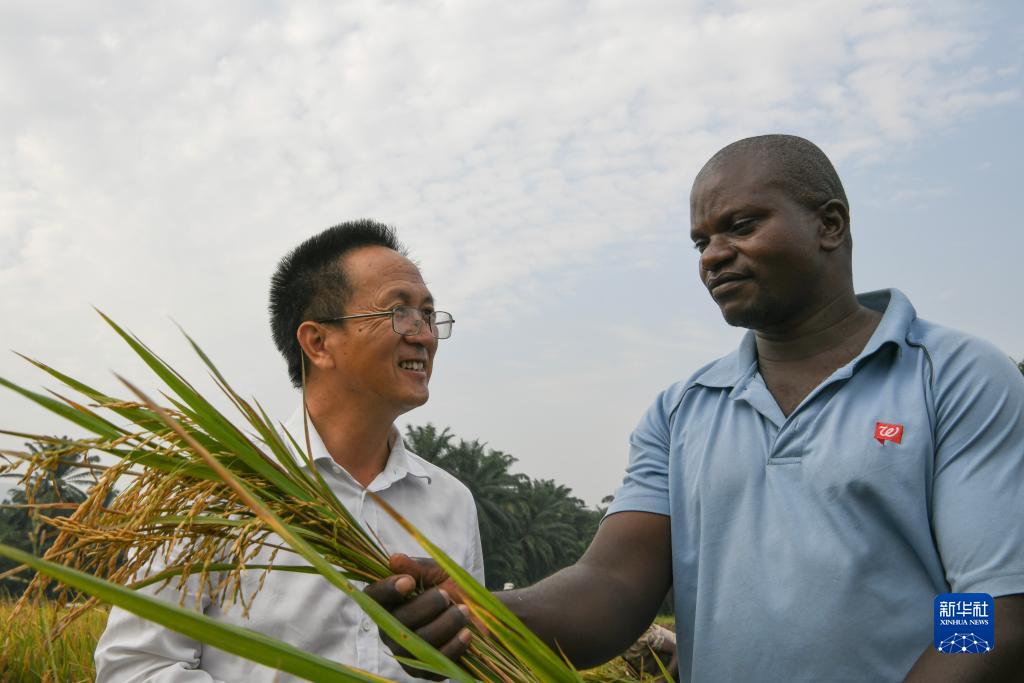 6月20日,在布隆迪布班扎省吉漢加縣,中國農業(yè)專(zhuān)家組組長(cháng)楊華德(左)在稻田間和夏爾交流。
