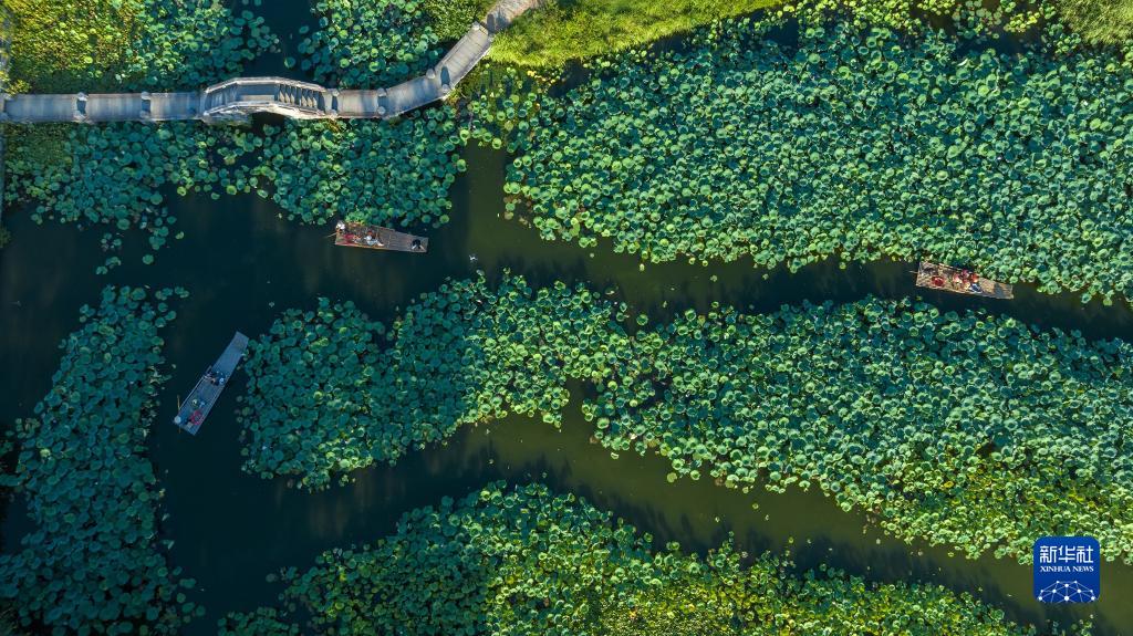 游客在黃山市徽州區呈坎古村乘竹筏游覽(8月4日攝,無(wú)人機照片)。