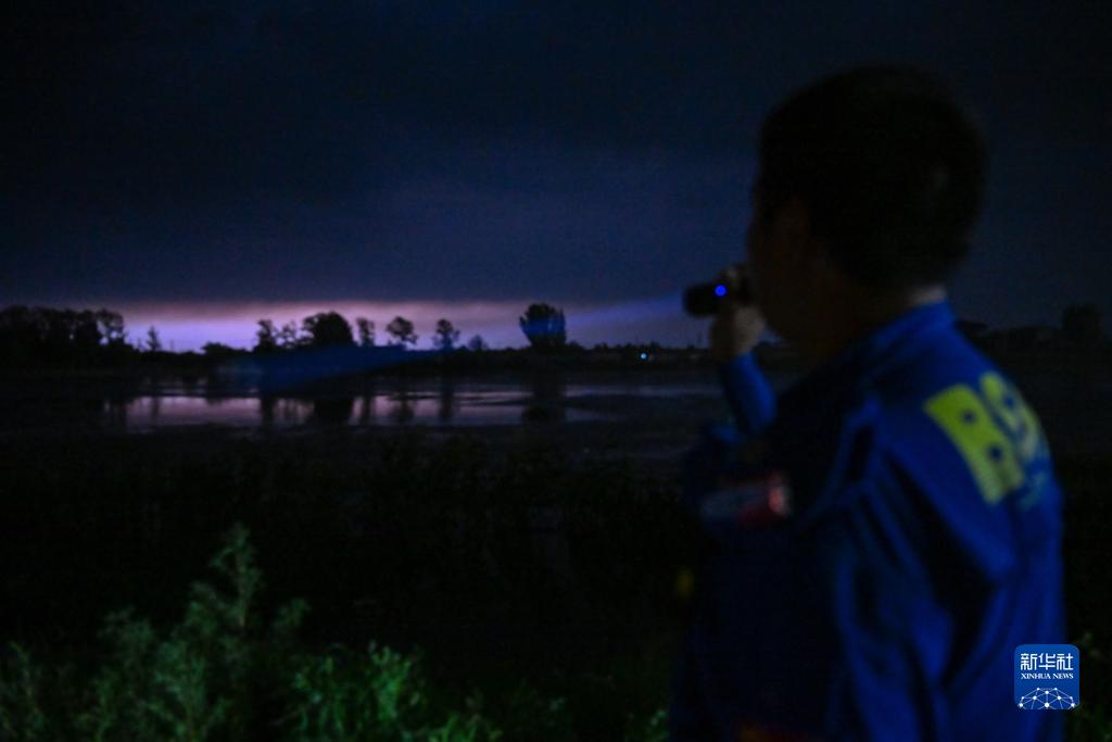 8月4日,在大清河天津靜海段北堤,天津靜海藍天救援隊隊員夜間巡堤時(shí)發(fā)現隱患點(diǎn)后,通過(guò)燈光指引南堤隊員現場(chǎng)查看。