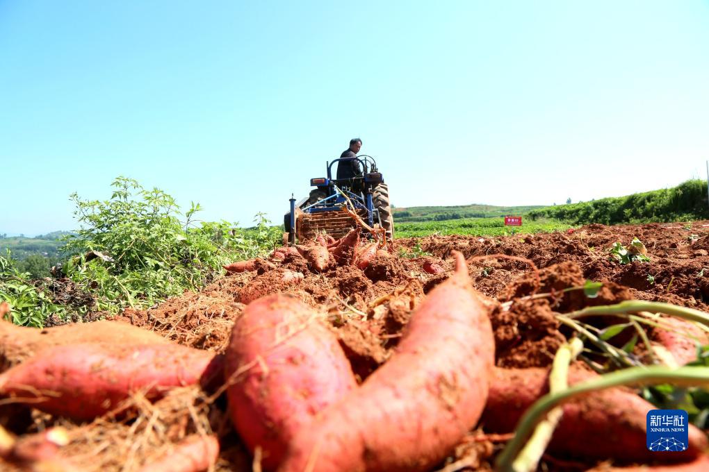 8月4日,河南省洛陽(yáng)市汝陽(yáng)縣劉店鎮在沙坪村舉行紅薯收獲現場(chǎng)會(huì ),農民駕駛機械在收獲紅薯。