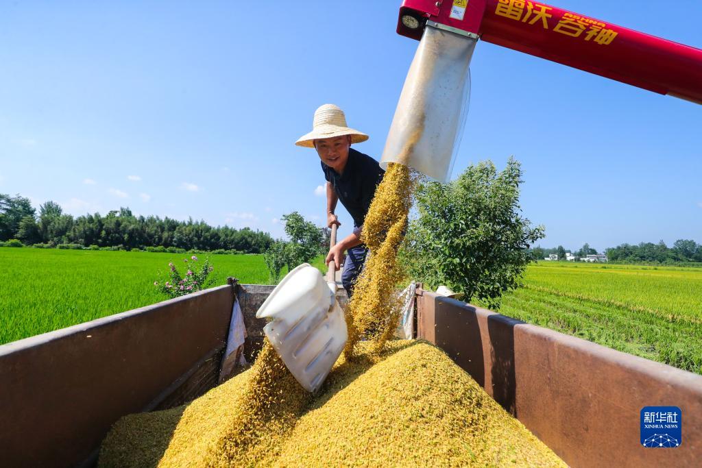 8月4日,河南省信陽(yáng)市光山縣南向店鄉何畈村鑫磊合作社社員在搶收頭茬再生水稻。