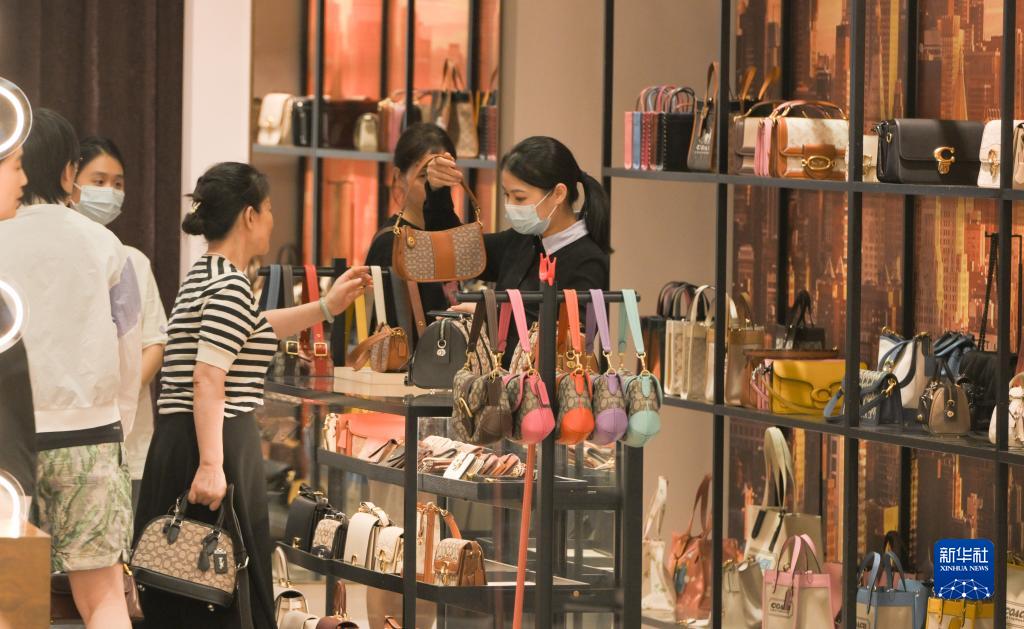 8月5日,游客在中免集團??谌赵聫V場(chǎng)免稅店選購商品。