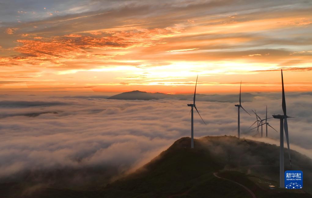 8月2日在衡東縣吳集鎮拍攝的朝霞映照下的風(fēng)力發(fā)電機組(無(wú)人機照片)。
