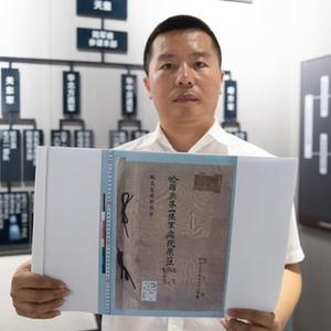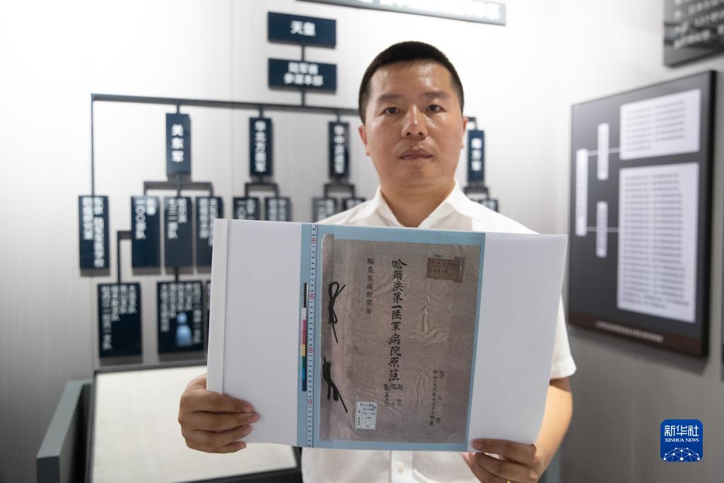 8月5日,在黑龍江省牡丹江市舉辦的侵華日軍細菌戰罪證陳列展上,研究人員展示《日軍哈爾濱第一陸軍病院原薄》(影印件)。