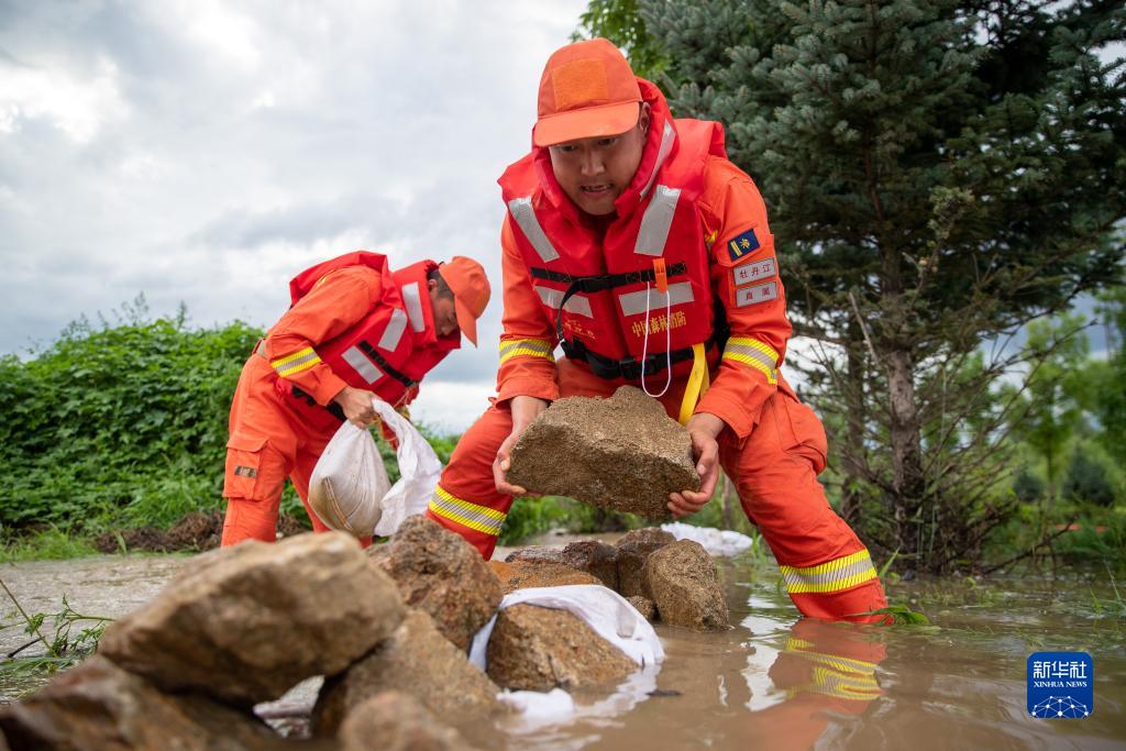 8月5日,在牡丹江市東安區大灣村附近,牡丹江市森林消防支隊的消防員搬運石頭封堵洪水。