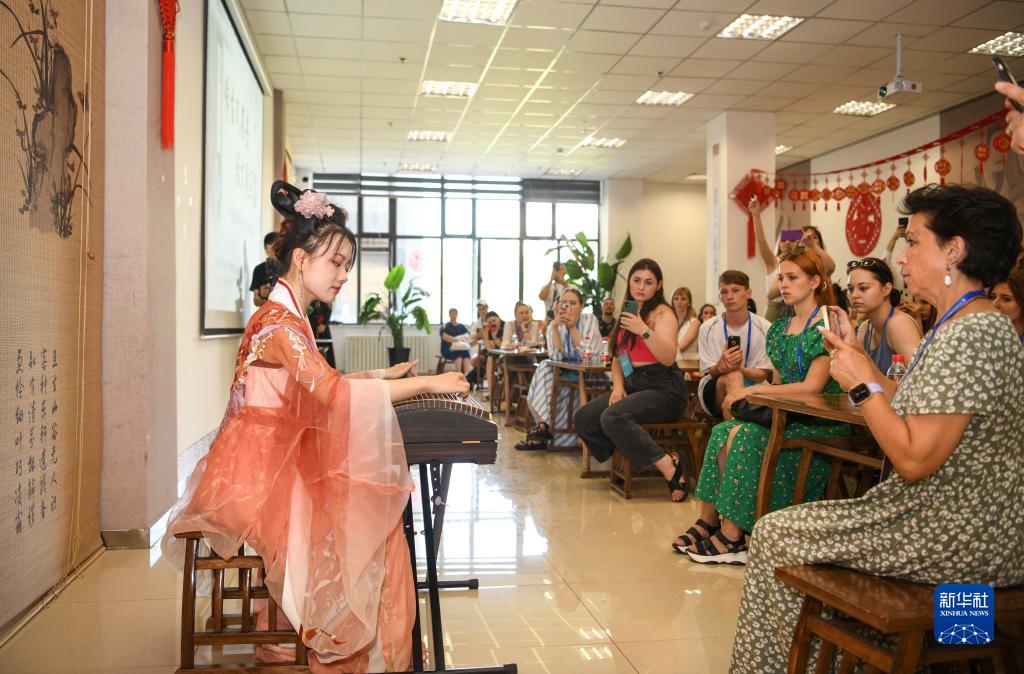 在新疆圖書(shū)館,烏魯木齊古箏愛(ài)好者為國外歌舞團演員演奏《漁舟唱晚》(7月23日攝)。