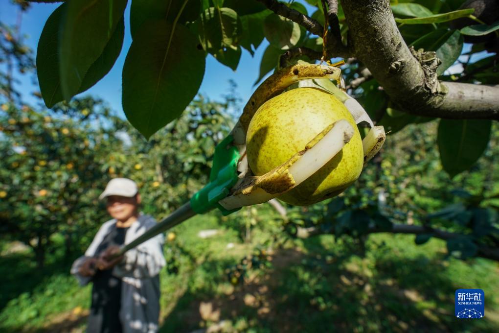 農戶(hù)在蘇州市樹(shù)山村梨園內采摘翠冠梨(8月3日攝)。
