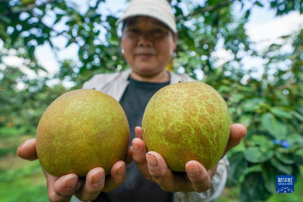 農戶(hù)在蘇州市樹(shù)山村梨園內展示剛采摘的翠冠梨(8月3日攝)。