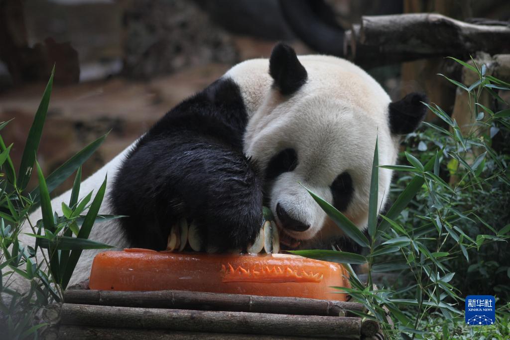 8月5日,在印度尼西亞茂物的印尼野生動(dòng)物園,大熊貓“彩陶”享用“生日蛋糕”。