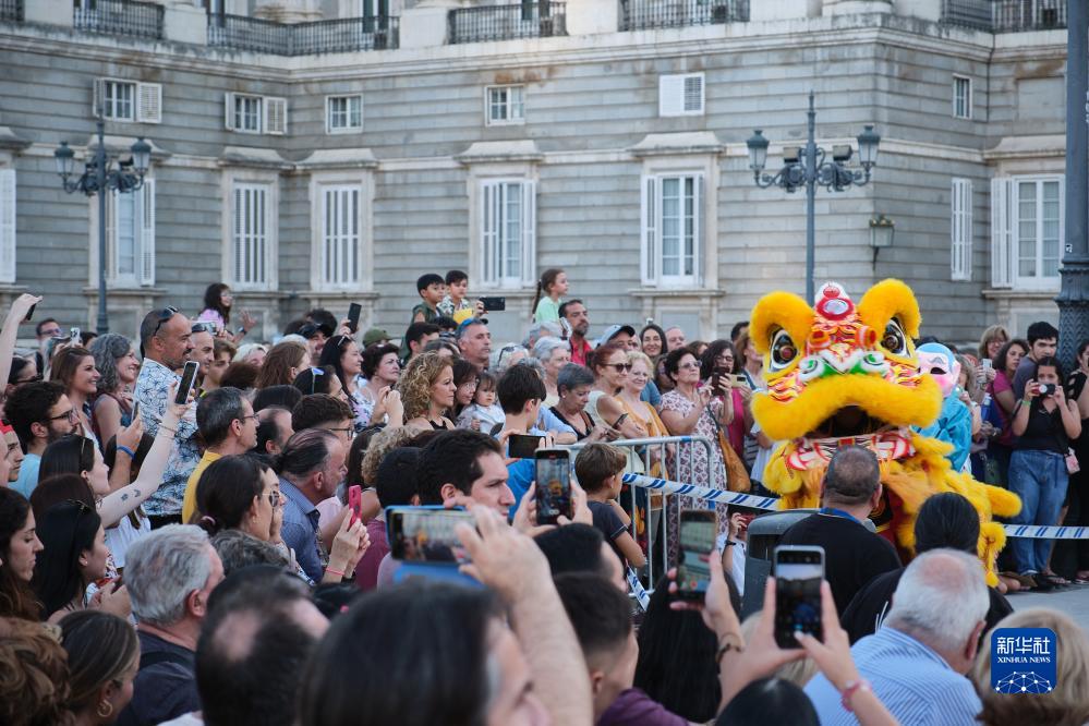 8月5日,演員在西班牙馬德里街頭進(jìn)行舞獅表演。