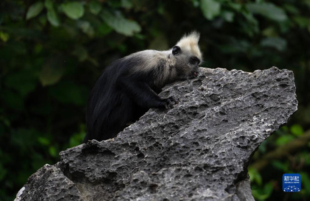 白頭葉猴,頭頂高聳著(zhù)一撮白毛,是我國特有的國家一級重點(diǎn)保護野生動(dòng)物,種群數量稀少,主要分布在廣西崇左市左江和明江之間約200平方公里的喀斯特石山地區。白頭葉猴還有個(gè)好聽(tīng)的名字——“石山精靈”。