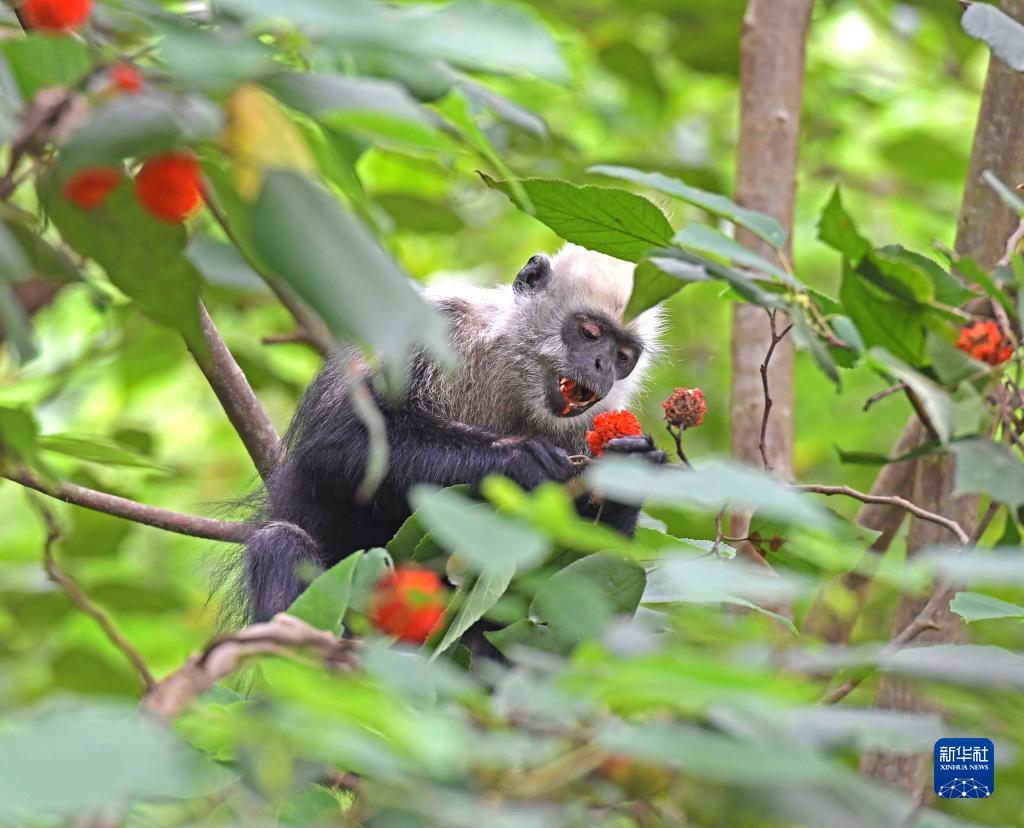一只白頭葉猴在吃構樹(shù)的果實(shí)(8月4日攝)。
