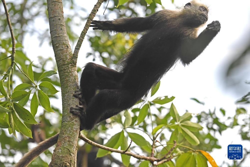 一只白頭葉猴在林間跳躍(8月5日攝)。