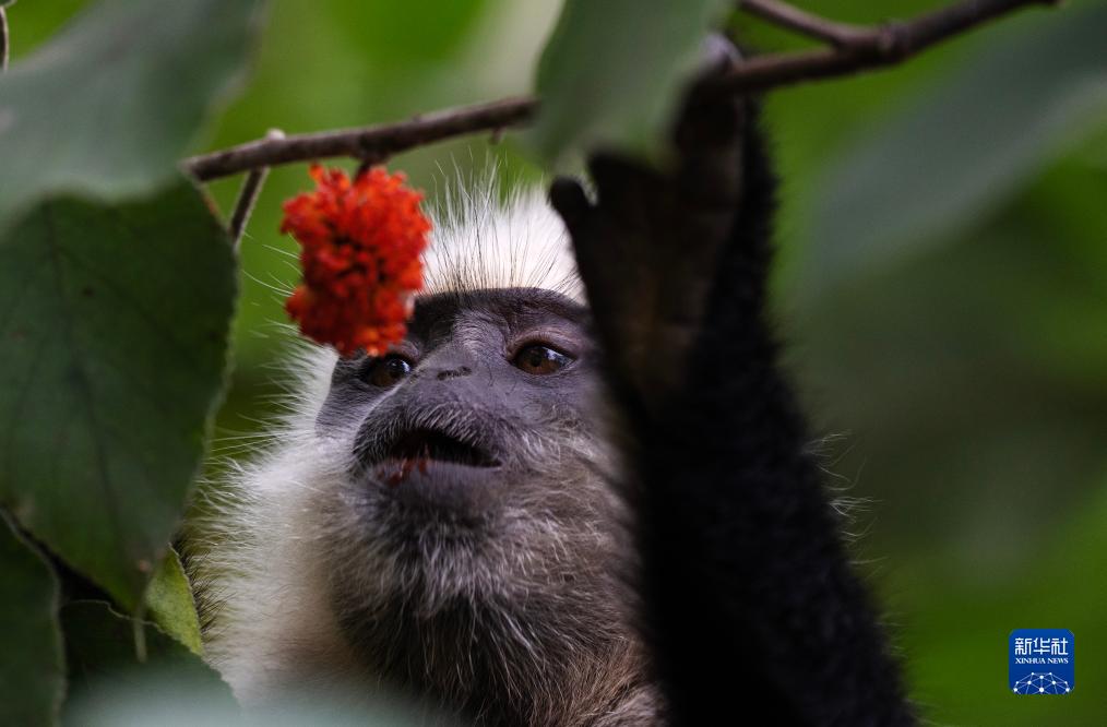一只白頭葉猴在吃構樹(shù)的果實(shí)(8月4日攝)。
