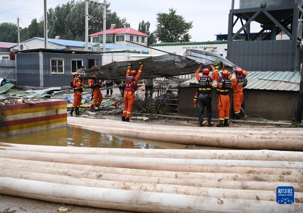 8月6日,在河北省涿州市刁窩鎮東張村,唐山消防救援支隊隊員在清除影響排澇作業(yè)的障礙物。