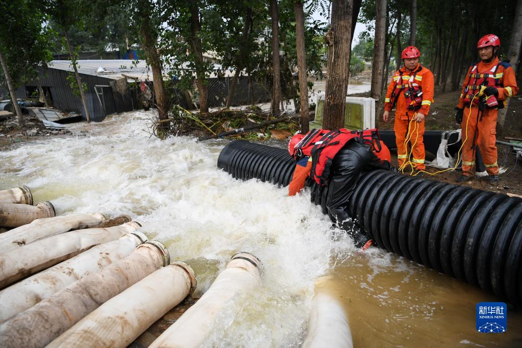 8月6日,在河北省涿州市刁窩鎮東張村,唐山消防救援支隊隊員在進(jìn)行排澇作業(yè)。